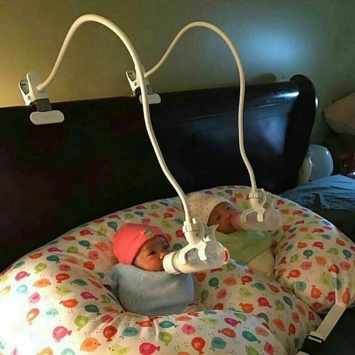 15. Και αυτή είναι μια καινοτομία από έναν δημιουργικό μπαμπά: πώς να ταΐσετε 2 μωρά ταυτόχρονα.