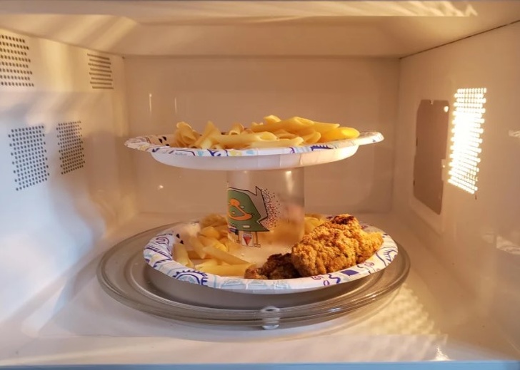 7. Ζεστάνετε ταυτόχρονα δύο πιάτα στο φούρνο μικροκυμάτων, βάζοντας ένα ποτήρι στο κέντρο.