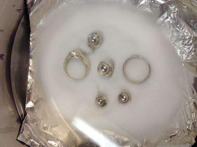 Πάρτε ένα μεγάλο δοχείο και καλύψτε το με αλουμινόχαρτο. Γεμίστε με ζεστό νερό και προσθέστε μισό φλιτζάνι σόδα. Αφήστε τα ασημικά μέσα για 30 λεπτά, μετά ξεβγάλτε τα και σκουπίστε τα με μαλακό πανί. Όλοι οι σκούροι λεκέδες θα έχουν φύγει χωρίς κανέναν κόπο καθώς η χημεία κάνει το θαύμα της.