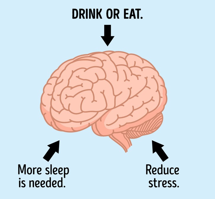 – Αν έχετε πονοκέφαλο στο πάνω μέρος του κεφαλιού, πρέπει να φάτε ή να πιείτε. Όσον αφορά τον πόνο στο μέτωπο, πρέπει να κοιμηθείτε.