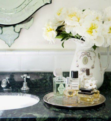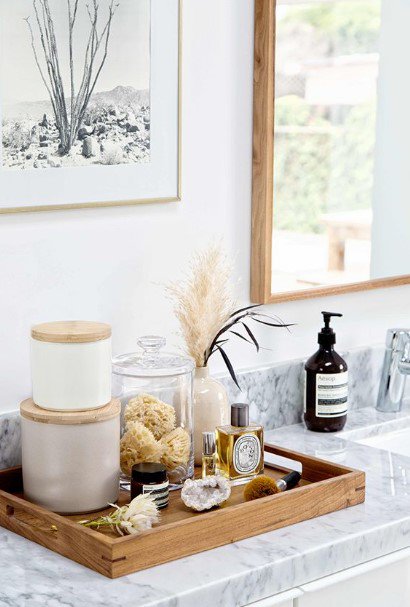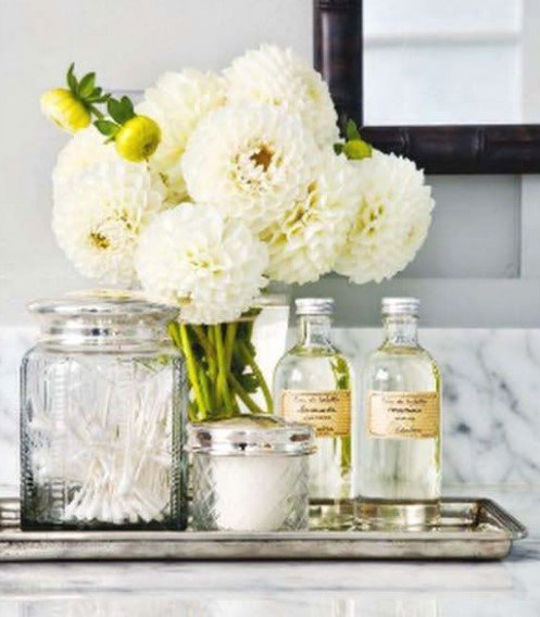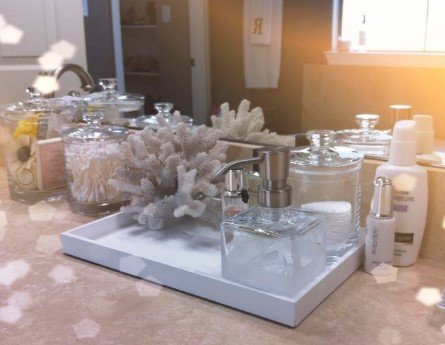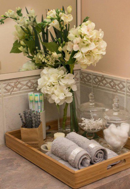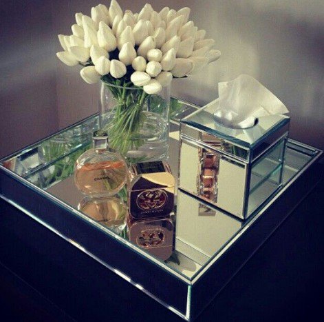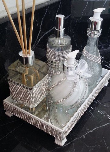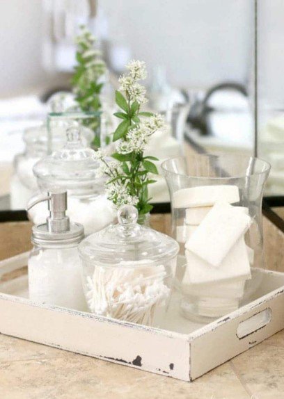 Ένας δίσκoς με καθρέπτη, θα χαρίζει στο μπάνιο σου την αίγλη και τη φινέτσα που ψάχνεις. Πρόσθεσε, όμορφα εντυπωσιακά βαζάκια με βαμβάκι, μπατονέτες και ότι πιστεύεις ότι πρέπει να βλέπει ο καλεσμένος σου. Ακόμη, μπορείς να βάλεις κάποιο μπουκάλι άρωμα, κεράκια και ένα μικρό γλαστράκι. Ή βαζάκι με λουλούδια για χρώμα και ένταση στο χώρο. Ότι και αν επιλέξεις το αποτέλεσμα θα είναι μοναδικό και θα αρέσει σε όλους όσους επισκεφτούν το χώρο.