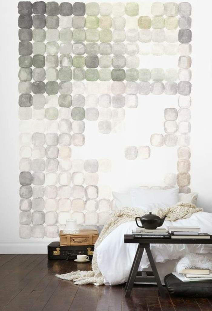 Ακόμα μια ιδέα είναι να δημιουργήσετε στον τοίχο αυτό και μόνο, ένα ιδιαίτερο σχέδιο. Στην αγορά θα βρείτε διάφορα stencil που μπορούν να σας βοηθήσουν. Επίσης εύκολος τρόπος είναι η χρήση της χαρτοταινίας σε διάφορα σχέδια για να δημιουργήσετε ένα ιδιαίτερο αποτέλεσμα. Ακόμα αν τα χέρια σας πιάνουν λίγο παραπάνω, μπορείτε να χρησιμοποιήσετε ένα σφουγγάρι και να φτιάξετε ένα σχέδιο σαν αυτό της τρίτης φωτογραφίας.