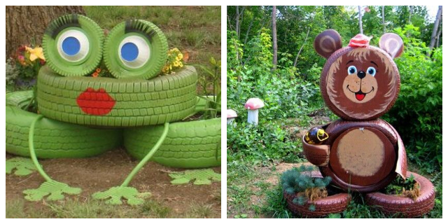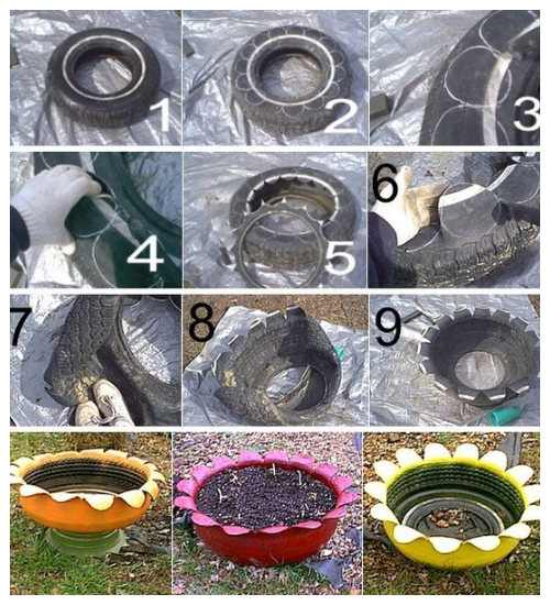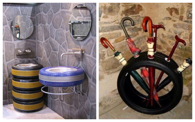 Με παλιά λάστιχα και μερικά κουτιά χρώμα ή χρώμα σε σπρέϋ, φτιάξτε εντυπωσιακές γλάστρες και ζαρντινιέρες, καθίσματα, τραπεζάκια, αλλά και παιχνιδοκατασκευές για τα παιδιά, έναν απλούστατο σκουπιδοτενεκέ για το εξοχικό, λιμνούλες για υδρόβια φυτά, κρεβάτια για τα κατοικίδια και ό,τι άλλο σκεφτεί η δική σας φαντασία.