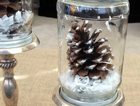 Πολύ απλά, κόλλησε το τούλι γύρω από το βάζο και κάνε έναν όμορφο φιόγκο με τον σπάγκο. Στη συνέχεια, κόλλησε τα κουκουνάρια στο βάζο και με το σπρέι βάψτα ώστε να μοιάζουν χιονισμένα. Τέλος, πρόσθεσε μέσα στο βάζο τα άλατα και βάλε όρθιο ένα κερί. Είναι πολύ εύκολο και θα αλλάξει αμέσως το χώρο σου.