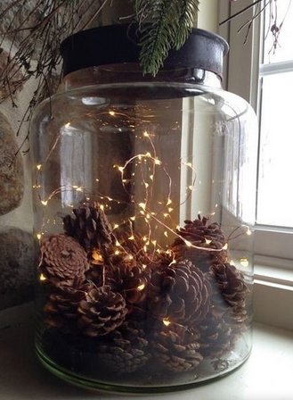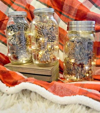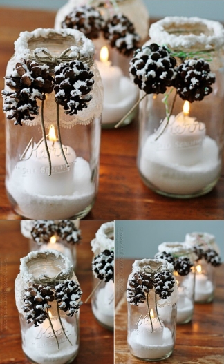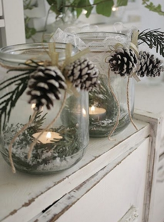Ακόμα μια φανταστική ιδέα, είναι να πάρεις κουκουνάρια για να διακοσμήσεις τα γυάλινα βαζάκια. Πρόκειται για μια απλή και πολύ κομψή λύση. Αρχικά, θα χρειαστείς: