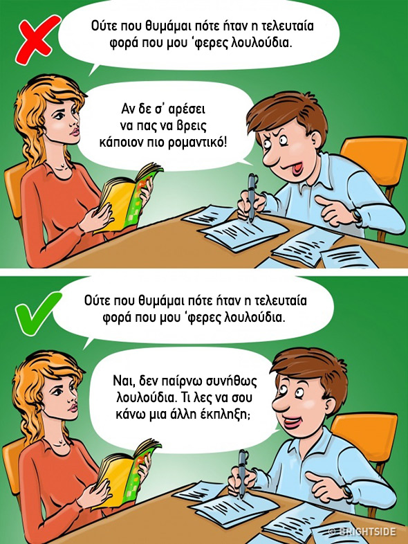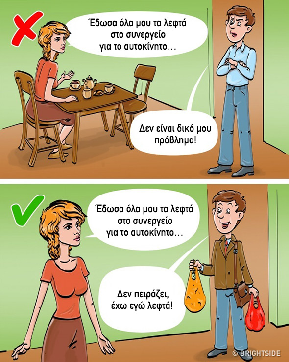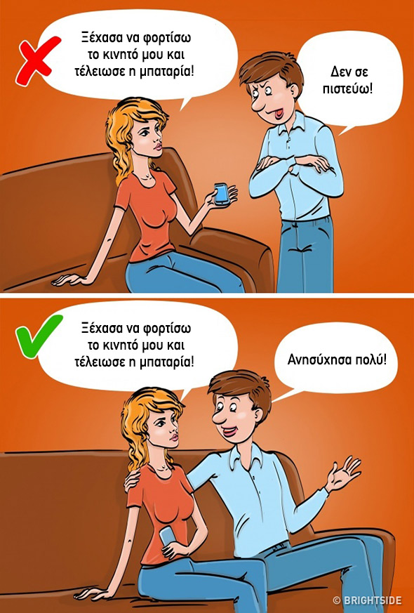 – Άμα δε σ’ αρέσει, να βρεις άλλον: Φράσεις όπως αυτές δείχνουν βαθιά υποτίμηση στη σχέση αλλά και αδιαφορία ως προς την εξέλιξη και τη δυναμική της. Επιπλέον, το ν’ ακούς απ’ τον σύντροφό σου την ψυχρή κι εριστική φράση «βρες άλλον» είναι και βαθιά χειριστικό: εκείνος ή εκείνη αρνούνται να αλλάξουν και πιστεύουν ότι οφείλεις να δεχτείς a priori τα ελαττώματά του/της. Μια σχέση αμοιβαίας αγάπης, όμως, δεν μπορεί να μην έχει το στοιχείο του συμβιβασμού και τη διάθεση για αυτοεξέλιξη μέσα απ’ την επικοινωνία και τις αμοιβαίες υποχωρήσεις.