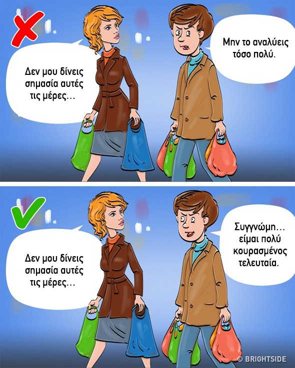 – Μην το αναλύεις τόσο πολύ: Ναι, εννοείται ότι αν πράγματι έχετε την τάση να υπεραναλύετε και να χιλιοσκέφτεστε το κάθε τι, κάποτε ο σύντροφός σας θα το επισημάνει –και πολύ καλά θα κάνει. Αρκεί η επισήμανση αυτή να γίνει με τρόπο τέτοιο που να έχει ως στόχο τη βελτίωση κι όχι την κριτική. Αν έχετε εντοπίσει ότι ο σύντροφος ή η σύντροφός σας απαντούν μ’ αυτόν τον τρόπο, μόνο όταν ζητάτε εξηγήσεις για κάτι, τότε μάλλον απλώς αποφεύγει την ανάληψη ευθυνών.
