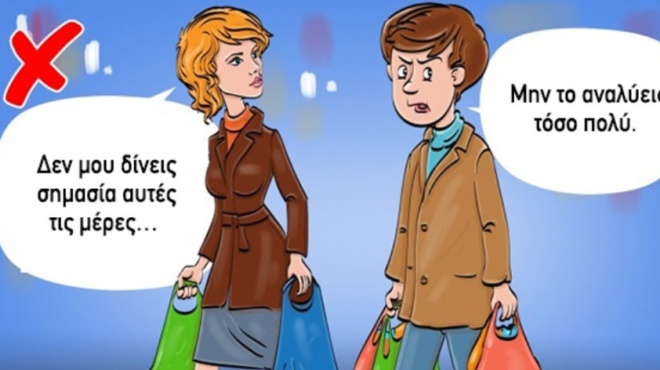 – Κάνε ό,τι θες: Και, φυσικά, δεν εννοούμε εδώ το συγκαταβατικό «Κάνε ό,τι θες» που σημαίνει εμπιστοσύνη και χαλαρότητα. Εννοούμε το βιαστικό, δεν-με-νοιαζει-τι-μου-λες «Κάνε ό,τι θες», που συνεπάγεται ψυχρότητα κι απόσταση, που δύσκολα γεφυρώνονται. Οι άνθρωποι που σ’ αγαπούν, θέλουν να είναι κομμάτι της ζωής σου, συνδράμοντας με όποιον τρόπο μπορούν -δεν τρέχουν μακριά από διλήμματα ούτε υποτιμούν την ανάγκη σου για μια συμβουλή.