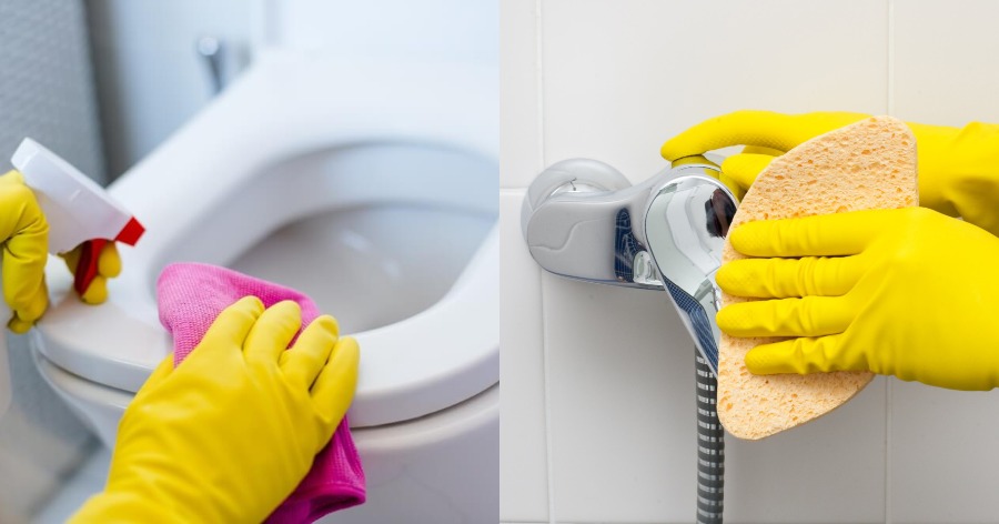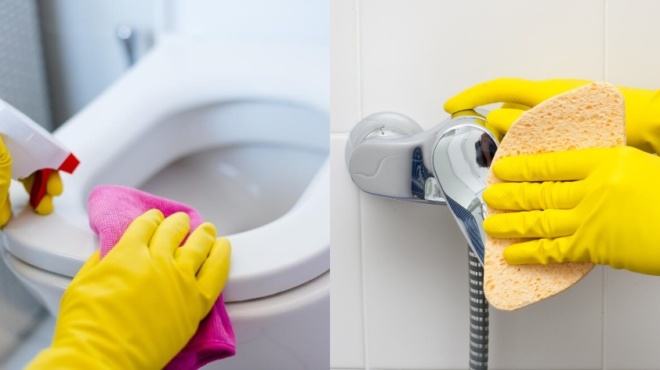 Στην βρύση και την βάση του νιπτήρα, καθώς και στο τηλέφωνο του ντους συσσωρεύονται πολλά άλατα, τα οποία δύσκολα μπορούν να αφαιρεθούν. Κόψτε ένα λεμόνι και τρίψτε τους λεκέδες. Στη συνέχεια, σ’ ένα μπουκάλι ψεκασμού αναμείξτε ½ κούπα νερό και ½ κούπα λευκό ξύδι. Ψεκάστε τις επιφάνειες και αφού περιμένετε λίγο, καθαρίστε τις με ένα πανί. Φροντίστε οι επιφάνειες τους να μείνουν στεγνές έτσι ώστε να μην εμφανιστούν λευκοί λεκέδες.