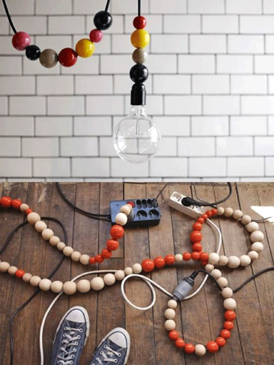 -Χάντρες: Μπορείτε να βρείτε σε καταστήματα με είδη χειροτεχνίας αμέτρητες χάντρες σε ποικιλία, χρωμάτων, σχεδίων, μεγεθών και υλικών κατασκευής. Διαλέξτε αυτές που σας αρέσουν περισσότερο αλλά και που ταιριάζουν στο στιλ διακόσμησης του χώρου σας και περάστε τες στα καλώδια.