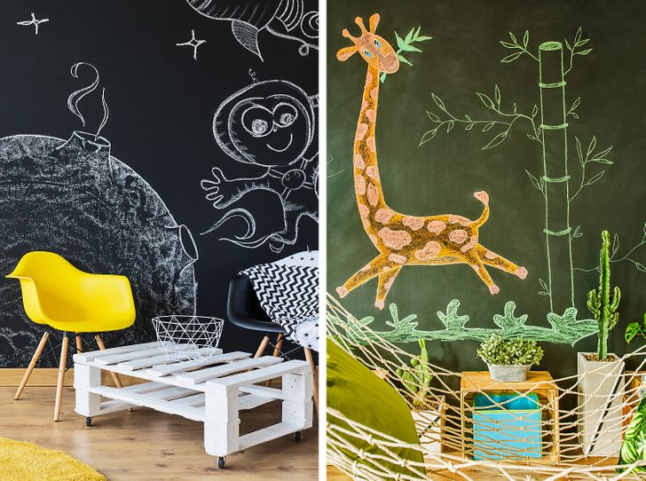 Εναλλακτικά, μπορείτε να προσθέσετε έναν τοίχο από μαυροπίνακα και να αφήσετε τα υπόλοιπα στο μικρό σας Picasso. Ο τοίχος θα είναι ένα μέρος όπου το παιδί μπορεί να εκφράσει το περιεχόμενο της καρδιάς του χωρίς να θυσιάσετε την ακριβή ταπετσαρία που διαλέξατε σχολαστικά. Με τα χρόνια, όταν δε θα χρησιμοποιούν πια τον μαυροπίνακα, ο τοίχος μπορεί απλά να βαφτεί.