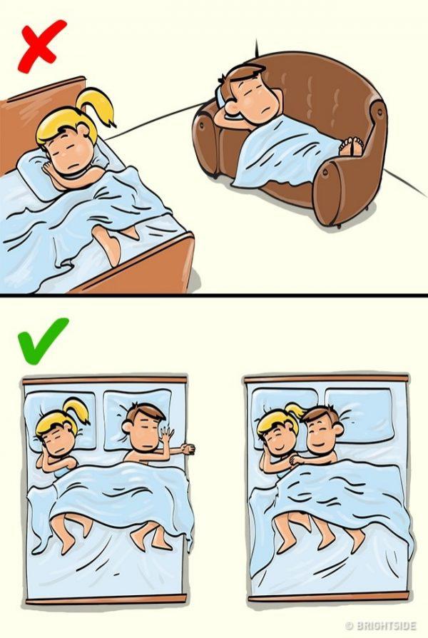 6. Μην πηγαίνετε στο κρεβάτι χωριστά: Όταν κοιμάστε χώρια, δείχνετε ότι δεν είστε έτοιμοι να τα ξαναβρείτε. Όμως, αν κοιμηθείτε μαζί, θα χαλαρώσει την ατμόσφαιρα και θα λύσει γρήγορα τη σύγκρουση.
