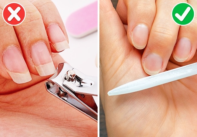 Κόβετε τα νύχια σας με νυχοκόπτη: Η επιφάνεια των νυχιών αποτελείται από νιφάδες. Αυτές, συσσωρεύονται μεταξύ τους σαν κεραμίδια. Χρησιμοποιώντας νυχοκόπτη, παραμορφώνεται η δομή των νυχιών σας. Δηλαδή, τα νύχια ξεκινούν να ξεφλουδίζουν και να σπάνε.
