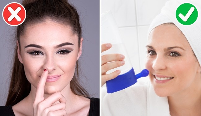 – Πλύνετε τη μύτη σας ρουφώντας νερό από την παλάμη σας με το δεξί και το αριστερό ρουθούνι σας εναλλάξ. Ή ακόμα καλύτερα, χρησιμοποιήστε μια ειδική συσκευή.