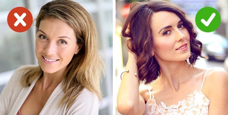 – Μακριά μαλλιά σε αυστηρή γραμμή: Τα μακριά μαλλιά σε αυστηρή γραμμή τονίζουν πολύ το πρόσωπό μας και τις αλλαγές του χρόνου πάνω μας. Για αυτόν τον λόγο, είναι καλύτερο να επιλέξετε ένα κοντό χτένισμα με φιλαρίσματα που θα κάνει το πρόσωπό σας να φαίνεται πιο στρογγυλό και νεανικό.