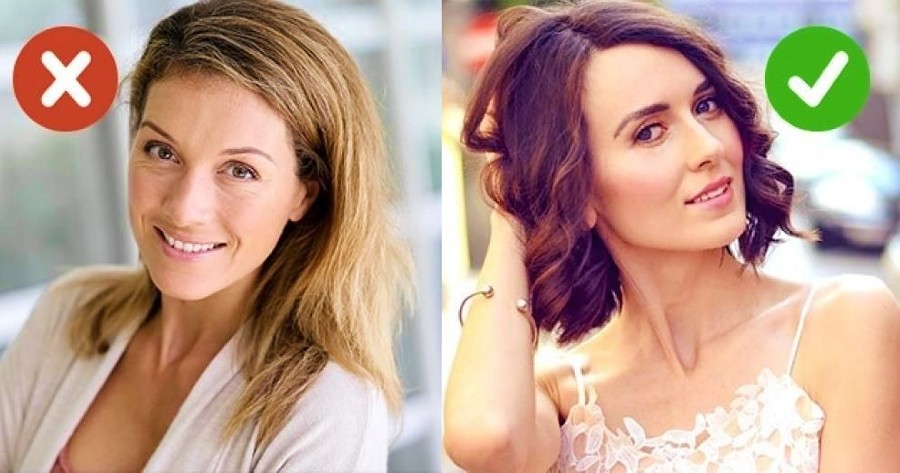 – Μακριά μαλλιά σε αυστηρή γραμμή: Τα μακριά μαλλιά σε αυστηρή γραμμή τονίζουν πολύ το πρόσωπό μας και τις αλλαγές του χρόνου πάνω μας. Για αυτόν τον λόγο, είναι καλύτερο να επιλέξετε ένα κοντό χτένισμα με φιλαρίσματα που θα κάνει το πρόσωπό σας να φαίνεται πιο στρογγυλό και νεανικό.