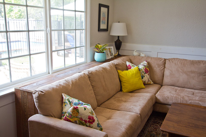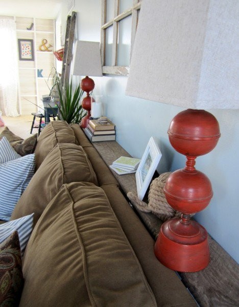 Προσθέστε ένα ξύλινο έπιπλο πίσω από τον καναπέ για να τοποθετήσετε επάνω του τα αγαπημένα σας διακοσμητικά