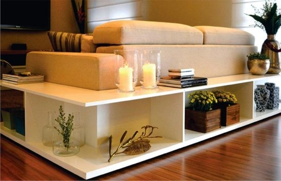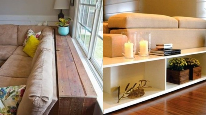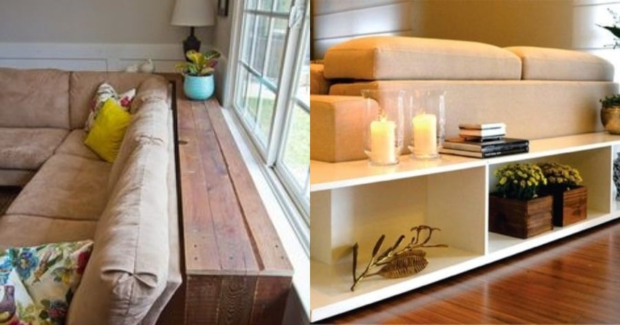Μια απλή κατασκευή που μπορείτε να την φτιάξετε ακόμα και μόνοι σας θα λύσει το θέμα του κενού και θα δημιουργήσει μια περιοχή ιδανική για διακόσμηση. Το μόνο που έχετε να κάνετε είναι να επενδύσετε με ξύλο το κενό κατά μήκος του καναπέ. Έπειτα μπορείτε να βάλετε πάνω του κεριά, διάφορα διακοσμητικά αντικείμενα και βιβλία.