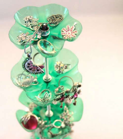 – Φτιάξτε μια υπέροχη κοσμηματοθήκη: Κόψτε το κάτω μέρος 4 ή 5 μπουκαλιών και τρυπήστε τα ακριβώς στη μέση. Περάστε από τη μέση ένα λεπτό κυλινδρικό σωλήνα και ασφαλίστε τον στην κορυφή με μια βίδα για να μην ανοίξει. Για να στέκεται σταθερή η κοσμηματοθήκη σας βάλτε την κάτω βάση προς την αντίθετη μεριά από αυτήν που βάλατε τις υπόλοιπες θήκες.