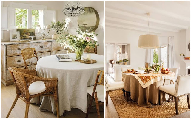 Καλύψτε το τραπέζι μέχρι κάτω με λευκό-μπεζ ύφασμα τύπου λινό, πολύ λεπτή λινάτσα ή παρεμφερή ποιότητα υφάσματος. Είναι ένας πολύ εύκολος τρόπος για να δημιουργήσετε μια ιδιαίτερα ατμοσφαιρική και σικάτη τραπεζαρία. Ανάλογα με τον τύπο καρέκλας που θα την πλαισιώσετε μπορεί να έχει κλασσικό, vintage ή πιο μοντέρνο στυλ.