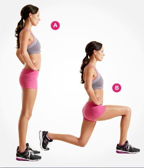 – Προβολές: Βήμα 1: Βάλε τα χέρια σου στους γοφούς και το δεξί σου πόδι λίγα εκατοστά πιο μπροστά από το αριστερό. Βήμα 2: Λύγισε το δεξί σου γόνατο φέρνοντας το στην ίδια ευθεία με τον αστράγαλο του ποδιού. Χαμήλωσε τους γοφούς σου και φέρε το αριστερό σου γόνατο προς το έδαφος.