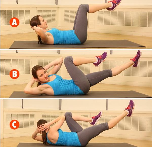 – Κοιλιακοί: Βήμα 1: Ξάπλωσε με το πρόσωπο να κοιτάει προς τα επάνω και ένωσε τα χέρια σου πίσω από το κεφάλι. Μάζεψε τα πόδια σου προς το στήθος και ανασήκωσε το κεφάλι, το λαιμό και τους ώμους σου από το πάτωμα. Βήμα 2: Στρίψε τον κορμό του σώματος σου προς τα δεξιά και φέρε τον αριστερό αγκώνα στο δεξί σου γόνατο.