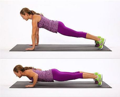 Σήκωσε τα γόνατα σου και πήγαινε τα πόδια σου προς τα πίσω ώστε το βάρος να πέφτει ακριβώς κάτω από τα δάχτυλα των ποδιών σου. Τα χέρια και το σώμα σου πρέπει να βρίσκονται στην ίδια ευθεία. Βήμα 2: Λύγισε τους αγκώνες σου, φέρνοντας το σώμα σου προς το έδαφος. Ίσιωσε πάλι τους αγκώνες για να επιστρέψεις στην αρχική σου θέση. Κάνε 10 επαναλήψεις.