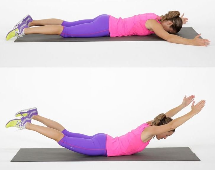 Βήμα 1: Ξάπλωσε με το πρόσωπο προς τα κάτω και τα χέρια απλωμένα μπροστά. Βήμα 2: Σήκωσε τα χέρια, το κεφάλι, το στήθος και τα πόδια σου από το έδαφος ανασηκώνοντας τη μέση σου μακριά από το πάτωμα. Διατήρησε αυτή τη θέση για μία αναπνοή και μετά επέστρεψε στην αρχική σου θέση. Κάνε 10 επαναλήψεις. Αν χρειάζεσαι στρώμα γυμναστικής για να κάνεις τις ασκήσεις βρήκα μερικά πολύ φθηνά!