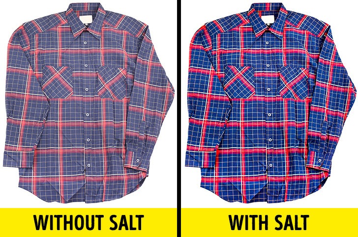 – Επαναφέρετε τα ξεθωριασμένα ρούχα με αλάτι: Μόλις τοποθετήσετε τα ρούχα και το απορρυπαντικό σας στο πλυντήριο, ρίξτε περίπου 1/2 φλιτζάνι (150 γρ.) αλάτι στον κάδο. Εκτός από την επαναφορά των χρωμάτων, μπορεί επίσης να βοηθήσει στην αποφυγή ξεθωριάσματος καινούργιων ρούχων. Αποφύγετε το χονδρό αλάτι καθώς μπορεί να μην διαλυθεί πλήρως στο πλυντήριο: Το αλάτι είναι επίσης αποτελεσματικό στην αφαίρεσης λεκέδων όπως αίμα, μούχλα και ιδρώτα.