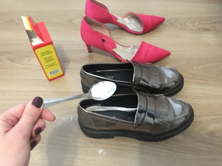 – Αφαιρέστε τις οσμές από παπούτσια με μαγειρική σόδα: Ρίξτε τουλάχιστον 1 κουτάλι σούπας μαγειρικής σόδα σε κάθε παπούτσι. Πρέπει να χρησιμοποιήσετε αρκετή σόδα για να καλύψετε ολόκληρη την εσωτερική σόλα του παπουτσιού. Εάν έχετε μεγάλα παπούτσια, ίσως χρειαστεί να χρησιμοποιήσετε περισσότερο από 1 κουταλιά σούπας μαγειρικής σόδα.