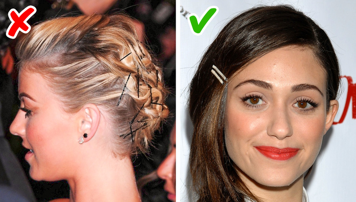 – Αόρατες φουρκέτες: Ο κύριος σκοπός των φουρκέτων είναι να διορθώσουν τα μαλλιά που πετάνε με σχεδόν αόρατο τρόπο. Οι ειδικοί συστήνουν τη χρήση φουρκέτας με 2 διαφορετικούς τρόπους: Ταιριάξτε τα με το χρώμα των μαλλιών σας και τα αποκρύψτε στα μαλλιά σας. Επιλέξτε φωτεινά κομψά φουρκέτα και τα χρησιμοποιήστε ως κύριο αξεσουάρ (μην το παρακάνετε με ποσότητα, λιγότερα είναι περισσότερα).