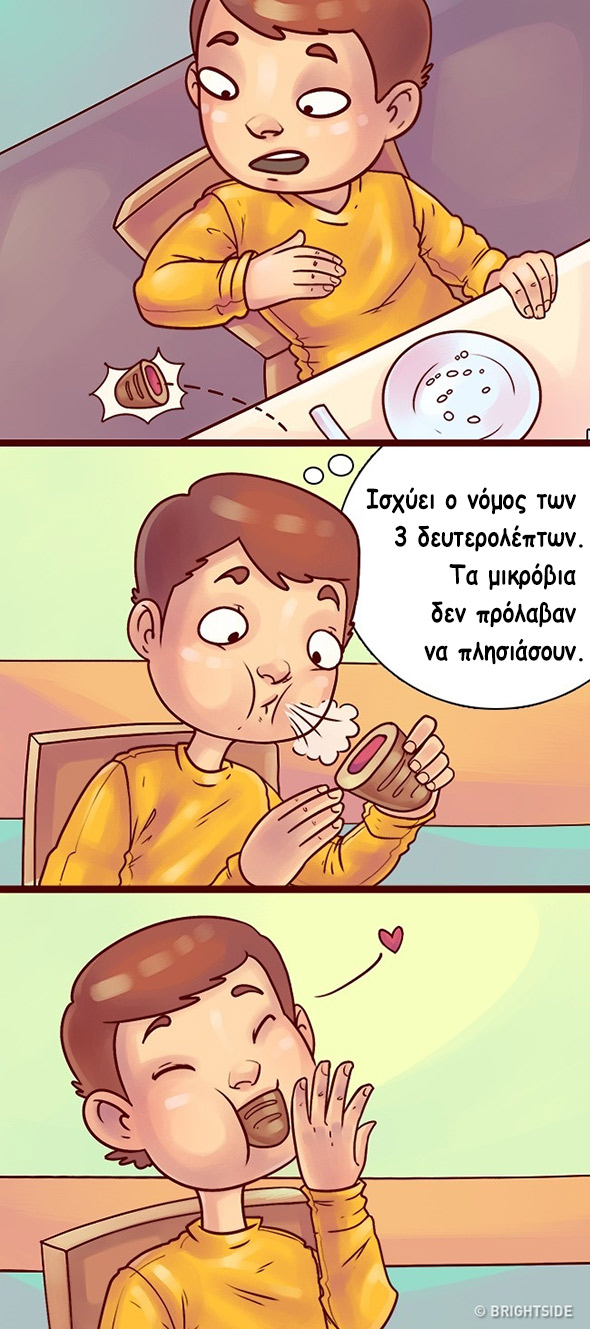 – Αν πιάσεις αυτή τη μία μπουκιά που έπεσε στο πάτωμα μέσα 3 δευτερόλεπτα, μπορείς να τη φας άφοβα: είναι κανόνας που εφαρμόζεται πάντα και παντού, εκτός αν είσαι με κόσμο.