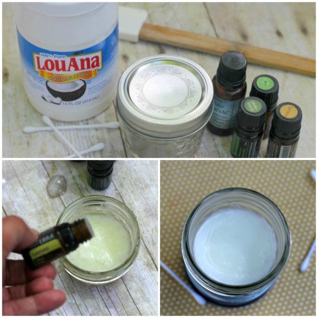 3. Λάδι καρύδας – Αιθέρια έλαια: Σε ένα βάζο, μαλακώστε ελαφρά 1/4 φλιτζάνι λάδι καρύδας (10 έως 15 δευτερόλεπτα στο φούρνο μικροκυμάτων πρέπει να φτάνουν). Στη συνέχεια, ανακατέψτε το λάδι καρύδας με 10 σταγόνες λεμονιού, λεβάντας, και έλαιο τεϊόδεντρου και ανακατέψτε καλά μέχρι να γίνει το μείγμα λείο.