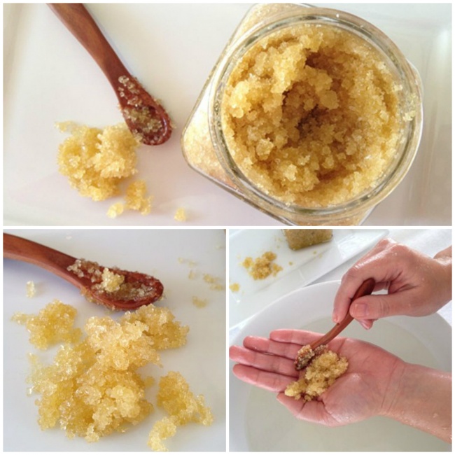 9. Ζάχαρη – Μέλι – Ελαιόλαδο – Εκχύλισμα βανίλιας: Αναμίξατε 1/4 φλιτζάνι λευκή ζάχαρη με 1/4 φλιτζάνι καφέ ζάχαρη σε ένα μπολ και ανακατέψτε. Προσθέστε 1/4 φλιτζάνι ελαιόλαδο και ανακατεύετε καλά. Στη συνέχεια αναμίξατε 1 κουταλιά της σούπας μέλι και 1/2 κουταλάκι του γλυκού εκχύλισμα βανίλιας.