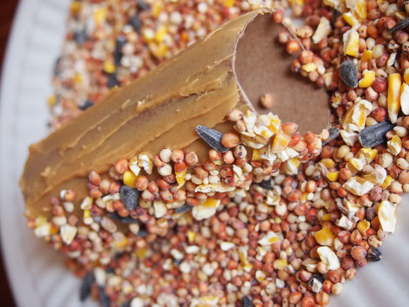 Καλύψτε ένα ρολό με φυστικοβούτυρο και μετά ρίξτε πάνω σπόρους για πουλιά μέχρι να καλυφτεί εντελώς.