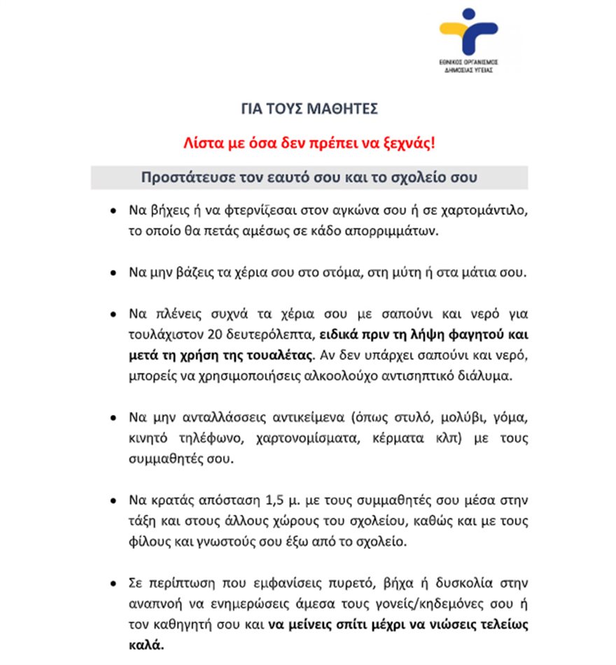 Απευθυνόμενο στους μαθητές το υπ. Παιδείας τους καλεί να τηρούν τις αποστάσεις αλλά και να ακολουθούν τους κανόνες σε περίπτωση βήχα ή φταρνίσματος.