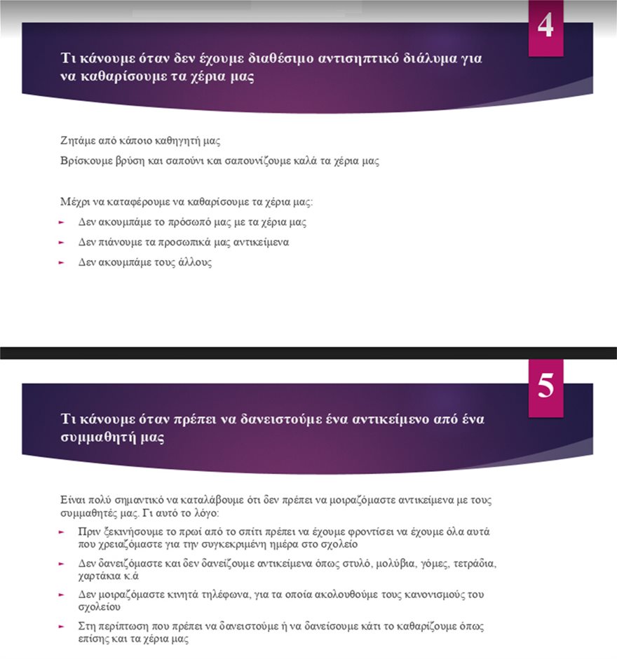 Αντίστοιχες οδηγίες περιλαμβάνονται και σε έναν οδηγό 17 σελίδων με εικόνες και επεξηγήσεις για τη συμπεριφορά μέσα στη σχολική μονάδα.