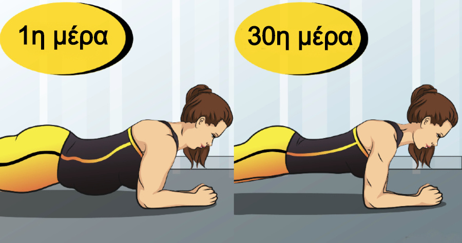 Αν θέλετε να το κάνετε αυτό, θα πρέπει να έχετε σωστή στάση και θέση σώματος. Το ανώτερο μέρος του σώματος θα πρέπει να είναι ίσιο με τους αγκώνες και τα δάχτυλα των ποδιών καθώς είναι ελαφρώς ανυψωμένα. Συνεχίστε με την ευθεία θέση, πάρτε βαθιές ανάσες και νιώστε τους μύες του κορμού να δυναμώνουν μαζί με αυτούς του λαιμού και του κεφαλιού. Όταν κοντράρετε τους μύες των γλουτών, διαιρέστε ισόβαρα το βάρος στα δύο πόδια και τους αγκώνες για να έχετε περισσότερη ισορροπία και δύναμη. Όταν πετύχετε τη σωστή τοποθέτηση, απλά προσπαθήστε περισσότερο κάθε μέρα για να πετύχετε τον στόχο των 28 ημερών.