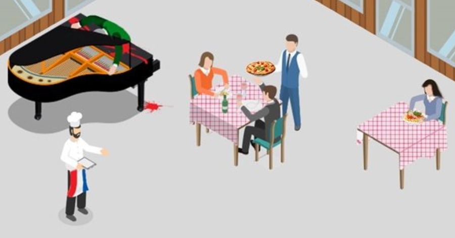 Ένα ζευγάρι που έπινε κόκκινο κρασί Τοσκάνης, ο σερβιτόρος του εστιατορίου που τους σερβίριζε την πίτσα και ο μάγειρας που ετοίμαζε την επόμενη σπεσιαλιτέ. Ένας από αυτούς είναι ο δολοφόνος! Δες με προσοχή τη φωτογραφία και κάθε της λεπτομέρεια. Ο δολοφόνος έχει κάνει ένα μοιραίο λάθος. Μπορείς να το(ν) βρεις;