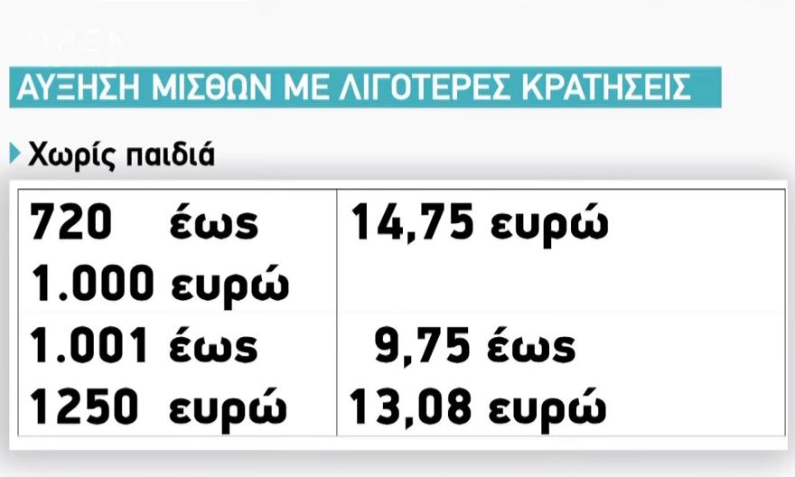 Ο μισθός ενός άτεκνου εργαζομένου κυμαίνεται από 720 ευρώ έως 1.000 ευρώ. Ο συγκεκριμένος υπάλληλος θα έχει μείωση 14,75 ευρώ, όσον αφορά τη μηνιαία παρακράτηση φόρου. Αυτό σημαίνει πως το συγκεκριμένο χρηματικό ποσό θα προστεθεί στον υπάρχον μισθό του εργαζομένου. Σε περίπτωση που κάποιος εργαζόμενος λάμβανε ως αμοιβή μεταξύ 1.001 ευρώ και 1.250 ευρώ, η αύξηση στο μισθό του θα ανέρχεται περίπου από 9 ευρώ έως 13 ευρώ.