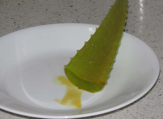 – Φοράμε latex γάντια. Κόβουμε το φύλλο της αλόης από το μητρικό φυτό όσο γίνεται πιο κοντά στο κορμό. Όσο μεγαλύτερο το φύλλο που επιλέξαμε τόσο περισσότερο χυμό περιέχει. Μόλις κόψουμε το φύλλο θα διαρρεύσει ένα καφεκίτρινο ή πρασινοκίτρινο υγρό. Αποφύγετε να το αγγίξετε. Αφήστε το φύλλο όρθιο για λίγα λεπτά να φύγει όλο το υγρό.