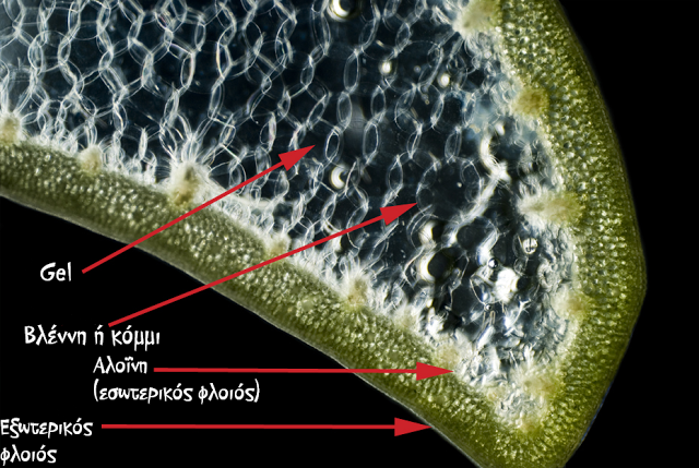 Σε περίπτωση που θέλετε να βγάλετε το gel της αλόης για εσωτερική κατανάλωση, συμβουλευτείτε πρώτα κάποιον ειδικό, ιατρό ή θεραπευτή. Μόλις πάρετε το ΟΚ, κάντε τη παραπάνω διαδικασία προσεκτικά, ώστε να έχετε στα χέρια σας μόνο το καθαρό gel και ξεπλύνετε το “φιλέτο” της αλόης μέ ξυδόνερο ώστε να αφαιρέσετε τα υπολείμματα του εσωτερικού φλοιού. Δείτε στη παρακάτω φωτογραφία ποιός είναι ο εσωτερικός φλοιός. Θέλουμε το gel και τη βλέννη, δε θέλουμε τον εσωτερικό και εξωτερικό φλοιό.