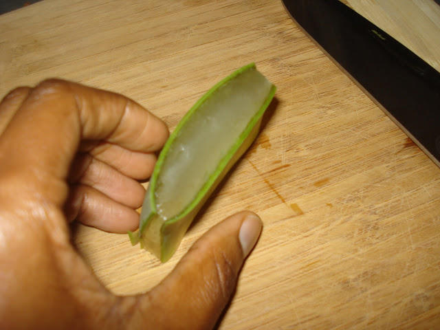 – Κόψτε τη μυτερή άκρη και απορρίψτε τη. Κόψτε τις κατά μήκος άκρες του φυτού, εκατέρωθεν με τα αγκάθια, και απορρίψτε τις και αυτές. Ξεπλύνετε το φύλλο με άφθονο νερό. Το φύλλο τώρα θα μοιάζει με ένα σάντουιτς από ζελέ. Το gel αλόης που θέλουμε είναι παγιδευμένο ανάμεσα στη χοντρή σάρκα του φυτού από την επάνω και κάτω μεριά.