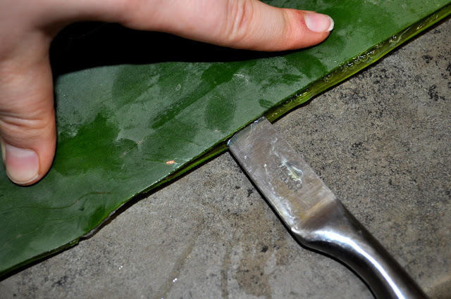 – Προσπαθήστε να αφαιρέσετε τη πράσινη σάρκα από τη επάνω μεριά, διατρέχοντας το μαχαίρι εσωτερικά κατά μήκος του φύλλου (όπως θα κάνατε και με το φιλέτο ενός ψαριού).