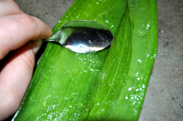 – Με ένα κουτάλι ξύστε απαλά όσο gel έμεινε πάνω στη σάρκα που αφαιρέσατε με το μαχαίρι. Προσέξτε να μη ξύσετε και τμήματα από το εσωτερικό φλοιό του φύλλου. Δεν τα θέλουμε επειδή περιέχουν αλοΐνη.