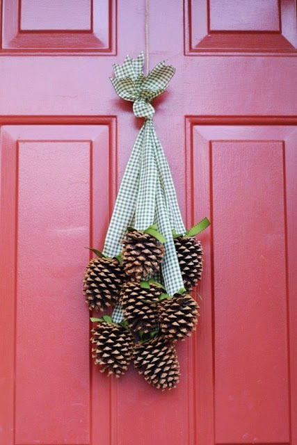 Φτιάξτε ένα όμορφο στεφάνι για την εξώπορτα με κουκουνάρια και κορδέλες.
