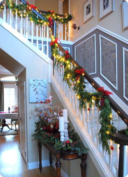 Στολίσετε τις σκάλες με κλαδιά ελάτου, φωτάκια και κόκκινες κορδέλες.
