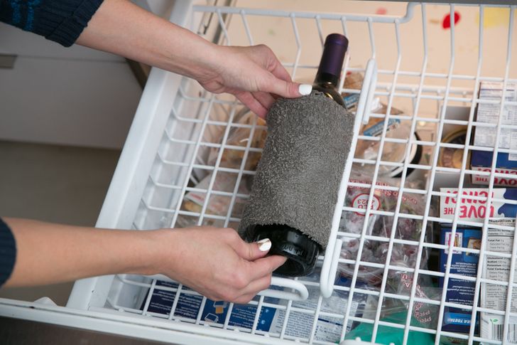 Τυλίξτε ένα μπουκάλι κρασί σε μια πετσέτα και βάλτε το στον καταψύκτη για 15 λεπτά για να κρυώσει γρήγορα. Θα το βρείτε σε αυτήν την πηγή.