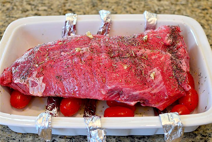Φτιάξτε τη δική σας σχάρα ψησίματος τυλίγοντας μερικά κομμάτια αλουμινόχαρτου και τοποθετώντας τα στο κάτω μέρος του ψητού. Το κρέας δε θα μαγειρευτεί με αυτόν τον τρόπο. Εδώ είναι η συνταγή του σεφ.