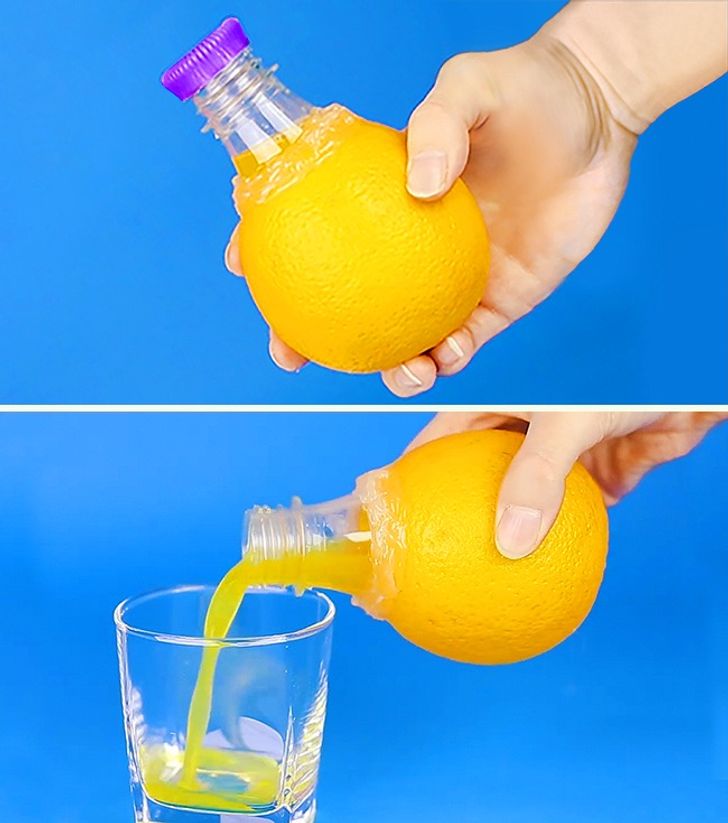 Εάν θέλετε λίγο φρέσκο ​​χυμό, αλλά δεν έχετε λεμονοστύφτη, δοκιμάστε αυτό το κόλπο. Κόψτε το λαιμό από ένα πλαστικό μπουκάλι και, στη συνέχεια, κάντε μια μικρή τρύπα στον φλοιό του μανταρινιού με τρόπο ώστε να ταιριάζει στον κομμένο λαιμό του μπουκαλιού. Κολλήστε το μανταρίνι στον λαιμό του μπουκαλιού, στύψτε το καλά και μετά απλώς ρίξτε το χυμό στο ποτήρι. Εδώ θα δείτε πώς γίνεται.